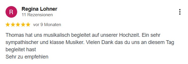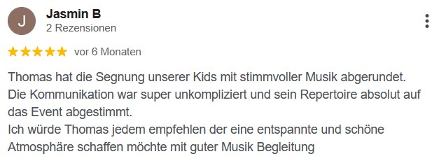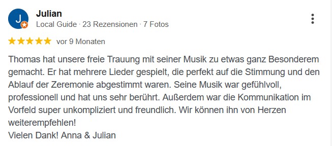 Gefühlvolle Instrumentalmusik zur Trauung, dezente Gitarrenklänge beim Sektempfang oder energievolle Songs auf eurer Feier am Abend.